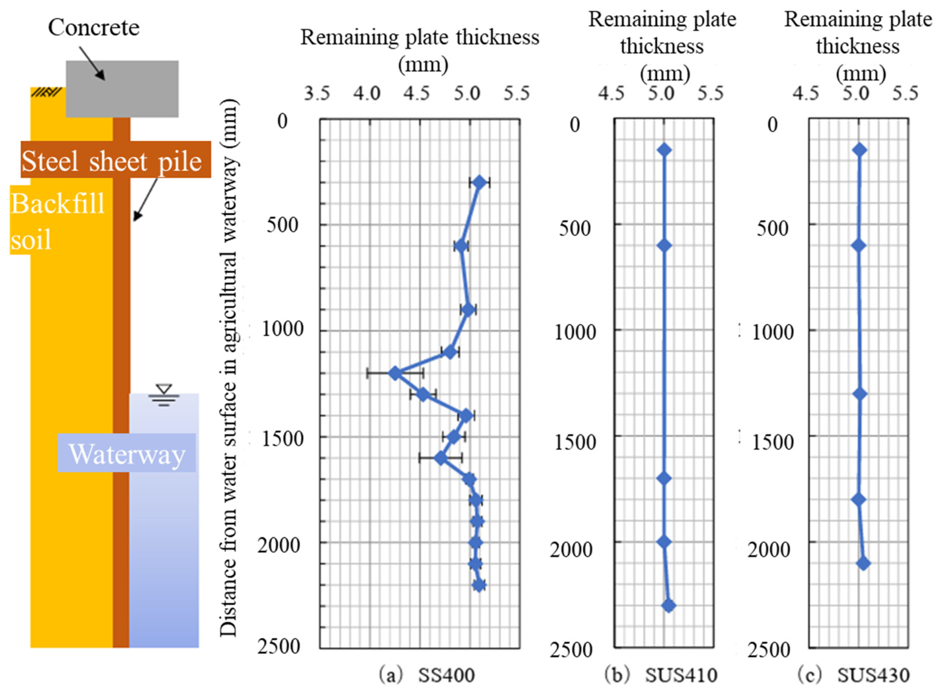 Figure 13. Remaining plate thickness profiles of SS400, SUS410, and SUS430 sheet piles measured by ultrasonic thickness gauge after 5 years of exposure.