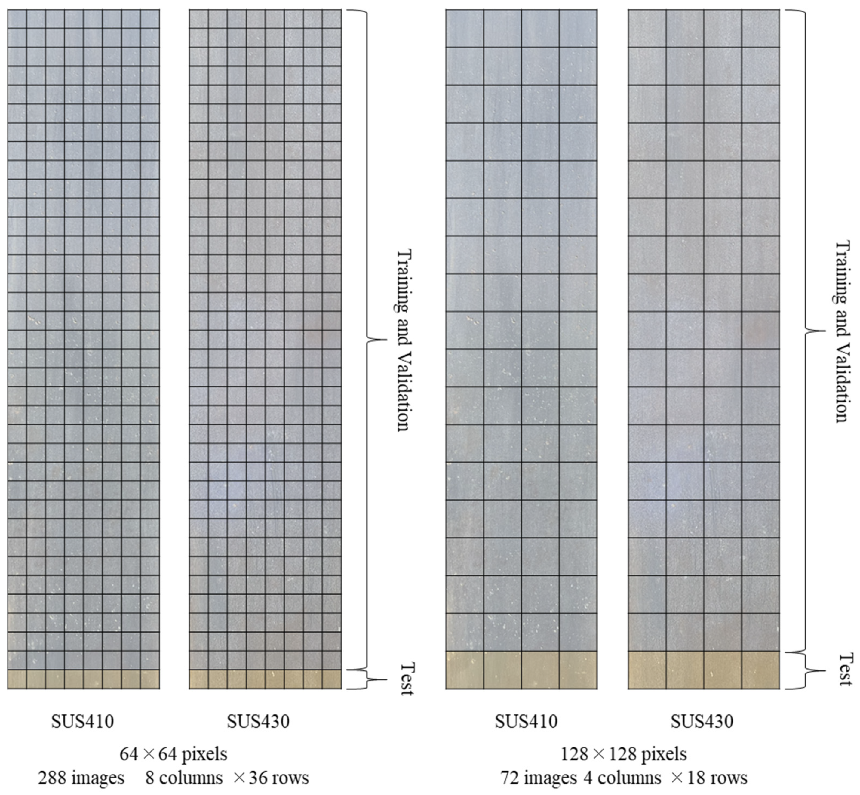 A 12-megapixel digital camera mounted on a smartphone was used as the imaging device. The selection of a smartphone camera was intentional to demonstrate that high-accuracy pitting corrosion detection can be achieved with readily available equipment; that specialized inspection equipment is not required; that the method can be easily implemented in practical field inspections; and that cost-effective solutions are feasible for routine monitoring. The captured images featured a high-resolution suitable for detecting sub-millimeter features; a wide aperture (f/1.8) enabling an adequate depth of field; a fast shutter speed (1/448 s) minimizing motion blur; a low ISO sensitivity (32) minimizing image noise; and a standard RGB format compatible with deep learning frameworks. The images used for analysis consisted of two images of the stainless-steel sheet pile after 5 years of exposure (Figure 15). From the photographed images, regions of approximately 60 mm × 270 mm were extracted from the locations where the surface was exposed. This extraction process focused on the representative areas with confirmed pitting corrosion provided sufficient data for training and validation, and maintained consistent scale and resolution. The extracted regions were used for deep learning-based pitting corrosion detection. The images were further divided into smaller patches (32 × 32; 64 × 64; 128 × 128; 256 × 256; or 512 × 512 pixels) for training and evaluation. Data segmentation into training, validation, and test sets was performed at the patch level, not at the original image level. After dividing each original image into patches, the patches were spatially partitioned so that patches from the lower region of each image were designated as the test set, while the remaining patches were used for training and validation, as illustrated in Figure 16.
