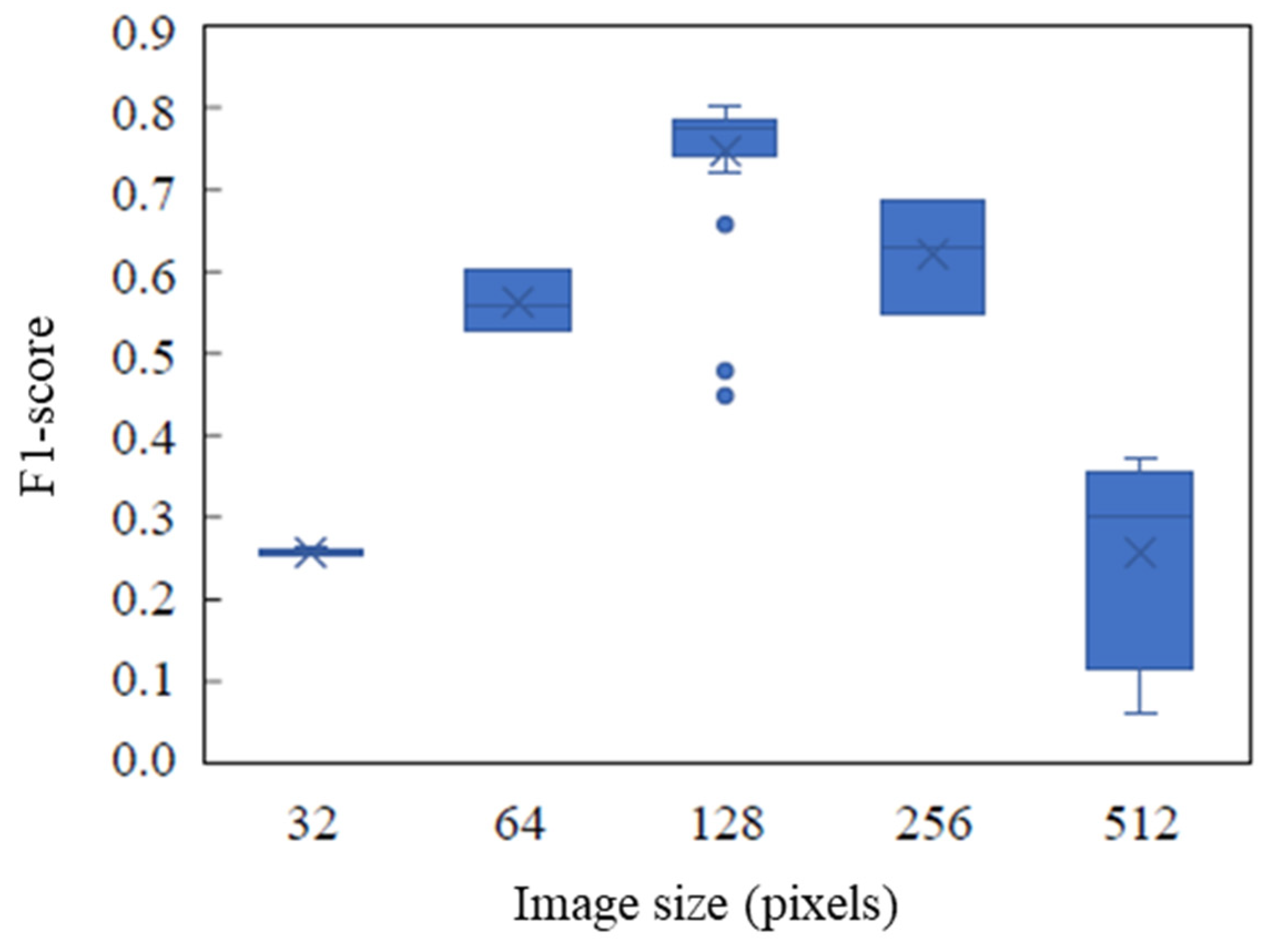 Figure 17. Box-and-whisker plot showing F1-score distribution for different image sizes (32, 64, 128, 256, 512 pixels).