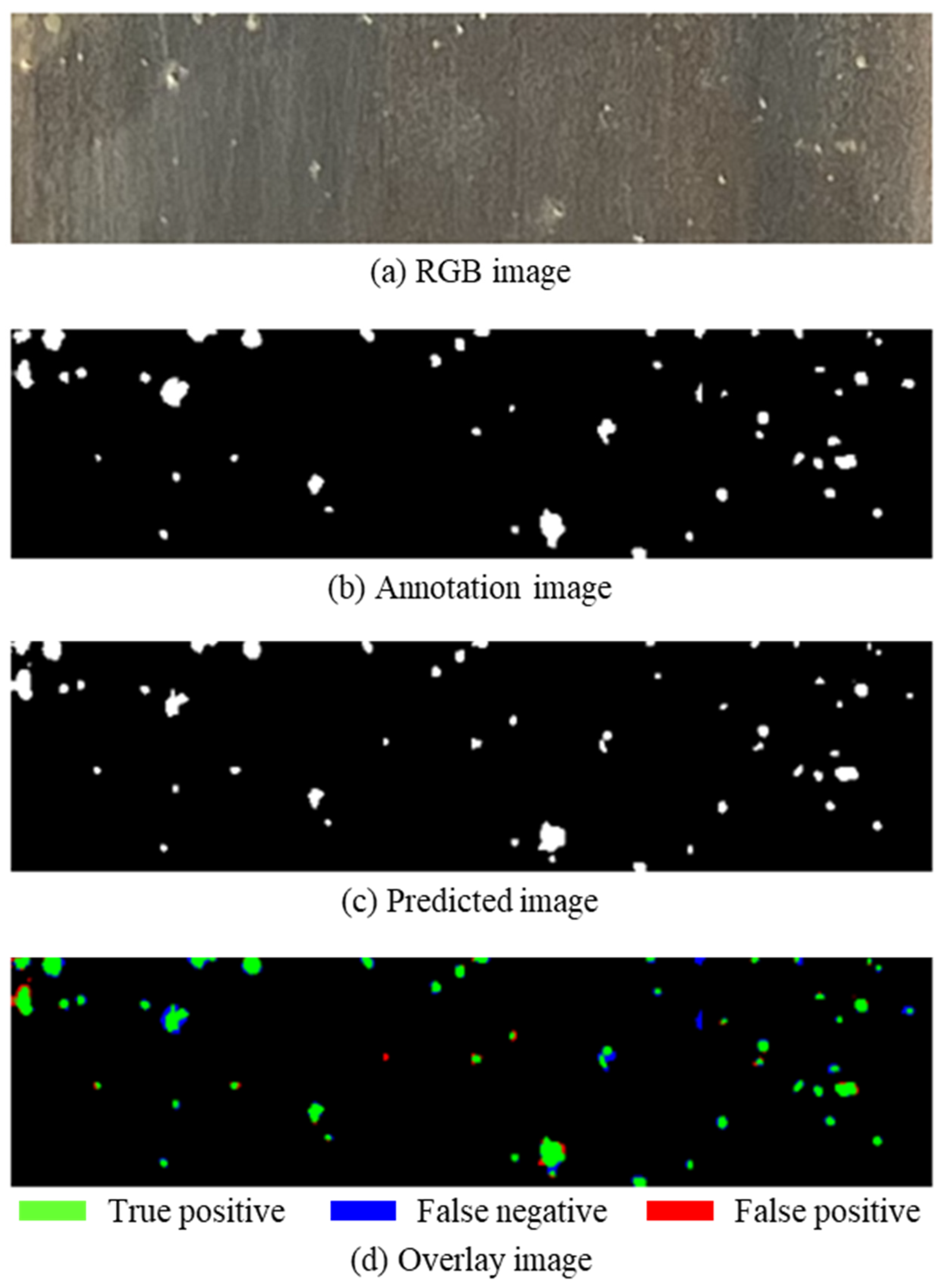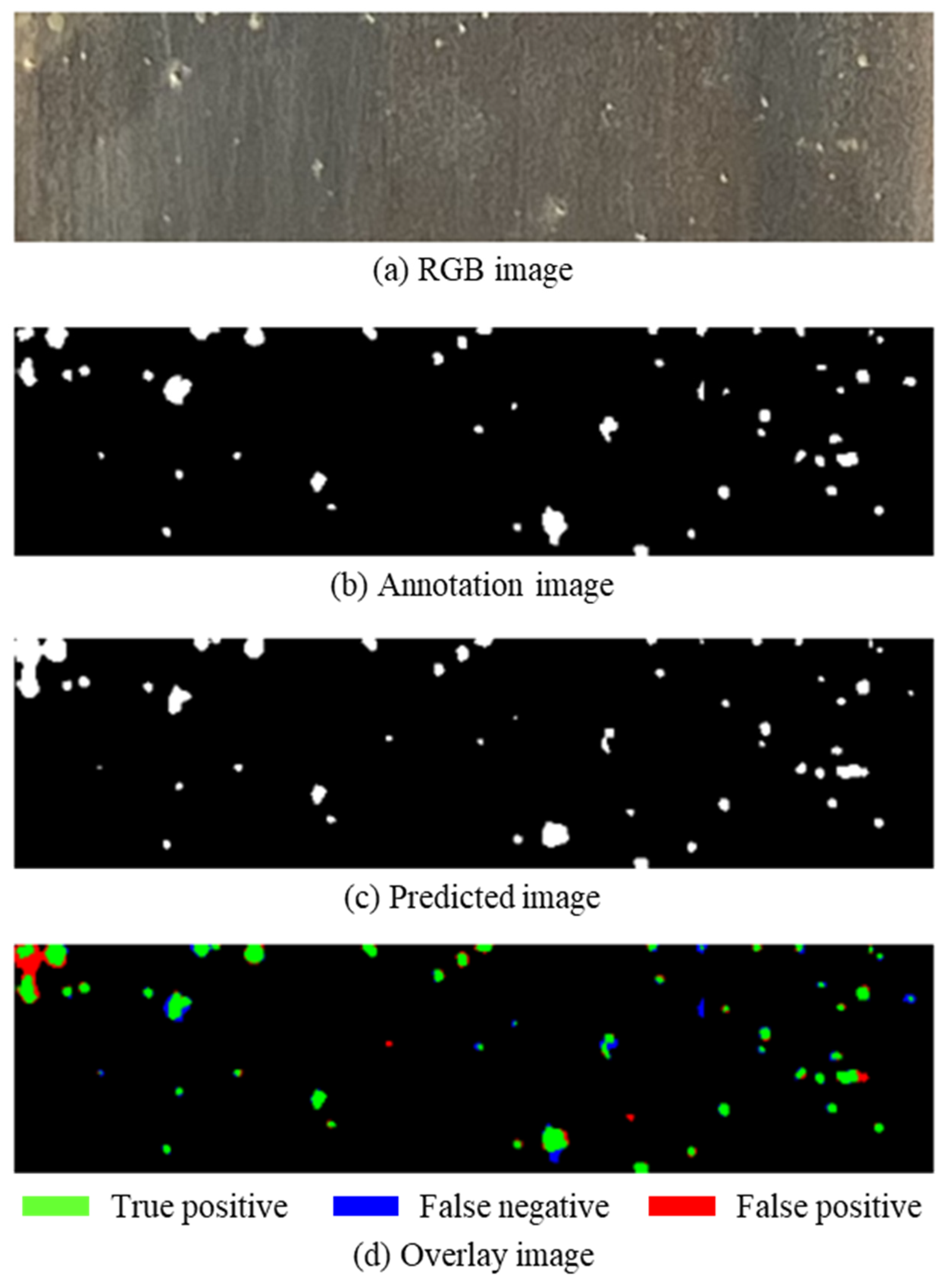 Figure 23 and Figure 24 present the detection results using whole-image binary thresholding for SUS410 and SUS430, respectively, while Table 9 and Table 10 show the corresponding performance metrics. Visual examination of Figure 23 and Figure 24 reveals dramatically different detection patterns compared to deep learning predictions. The green labels (true positives) are substantially fewer for both steel grades, indicating that the thresholding method correctly identified only a minority of actual pitting locations. In addition, both figures show extensive red labeling (false positives) in the left and right portions of the images. This pattern directly corresponds to the brightness variations documented in Figure 22, where regions with lower brightness values in the lower portions of the images generated numerous false detections as the globally optimized threshold classified normal surface characteristics as pitting. The combination of extensive false positives and moderate false negatives produced the characteristic pattern of poor precision with moderately low recall observed in the quantitative metrics. As shown in Table 9 and Table 10, precision values were extremely low at 0.318 (SUS410) and 0.258 (SUS430), representing less than one-third the precision achieved by deep learning (0.770–0.771). Recall values were 0.565 (SUS410) and 0.456 (SUS430), substantially lower than the 0.903 (SUS410) and 0.848 (SUS430) achieved by deep learning. The resulting F1-scores were 0.407 (SUS410) and 0.329 (SUS430), lower than the 0.831 (SUS410) and 0.808 (SUS430) achieved by deep learning. These F1-scores reflect the combined impact of poor precision and low recall, indicating a fundamentally inadequate detection performance for practical applications.