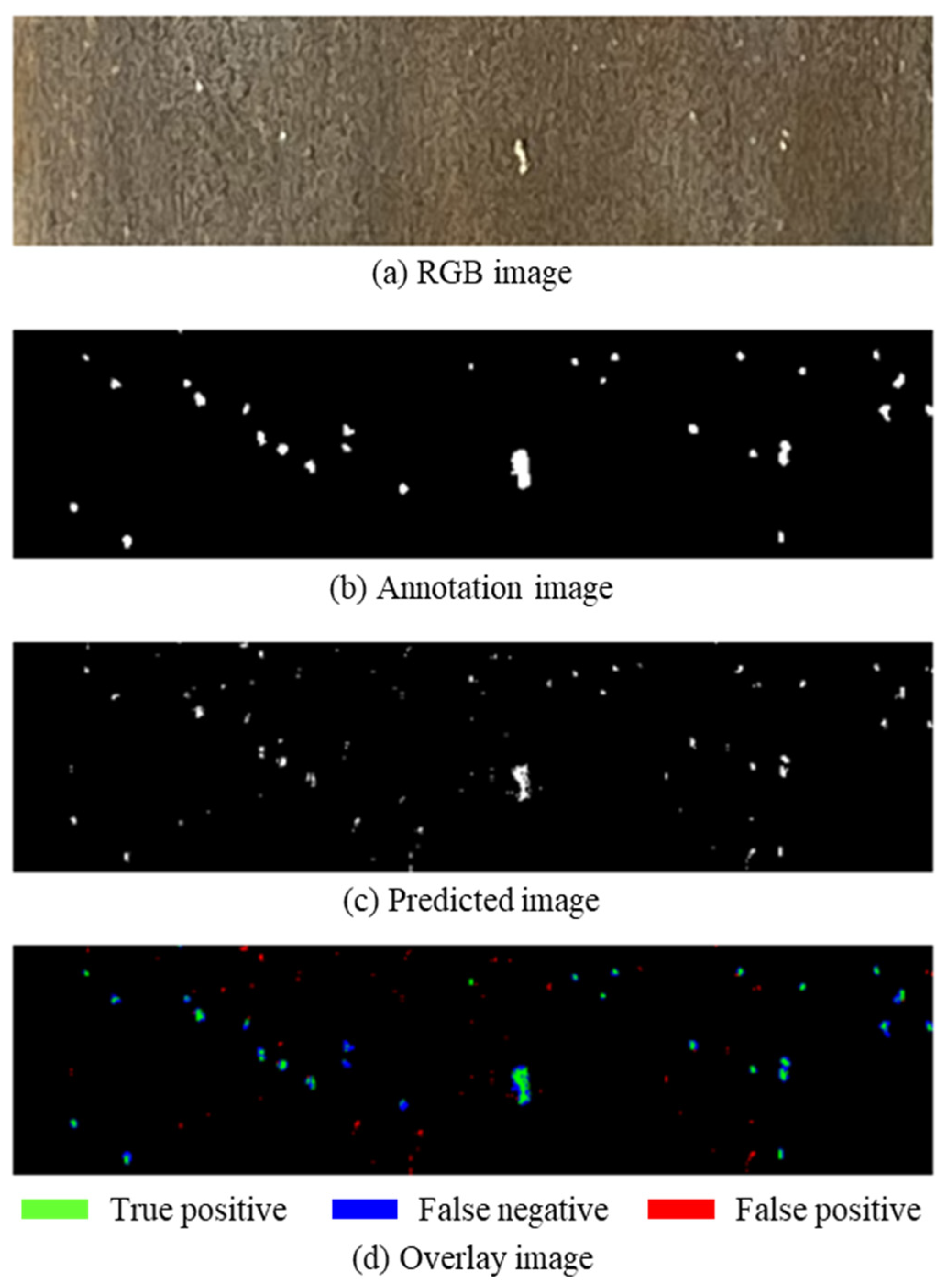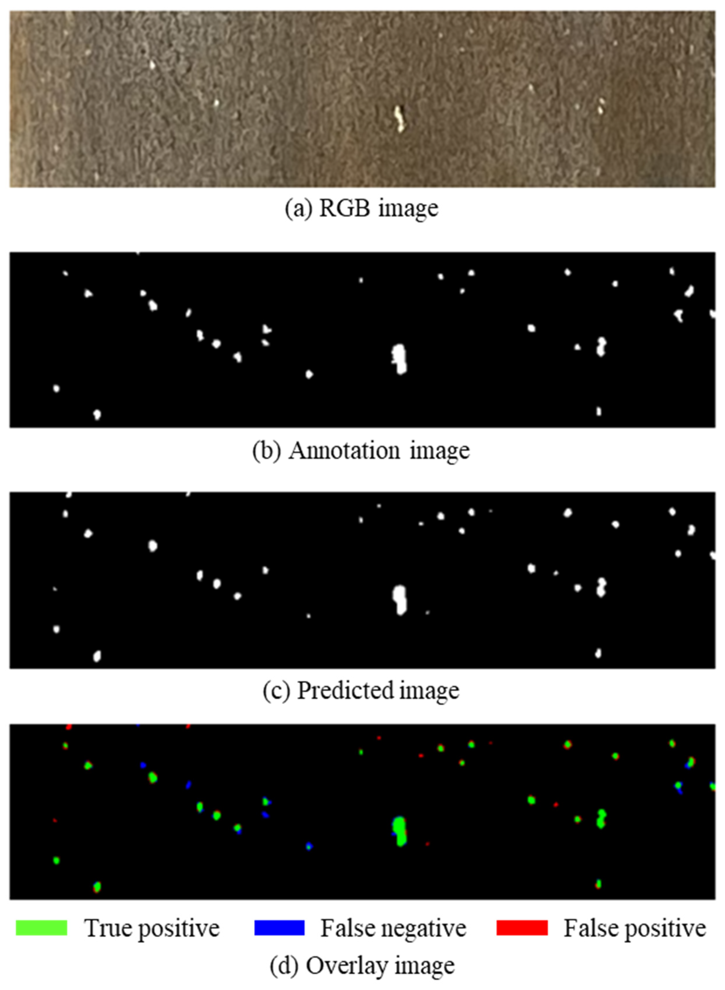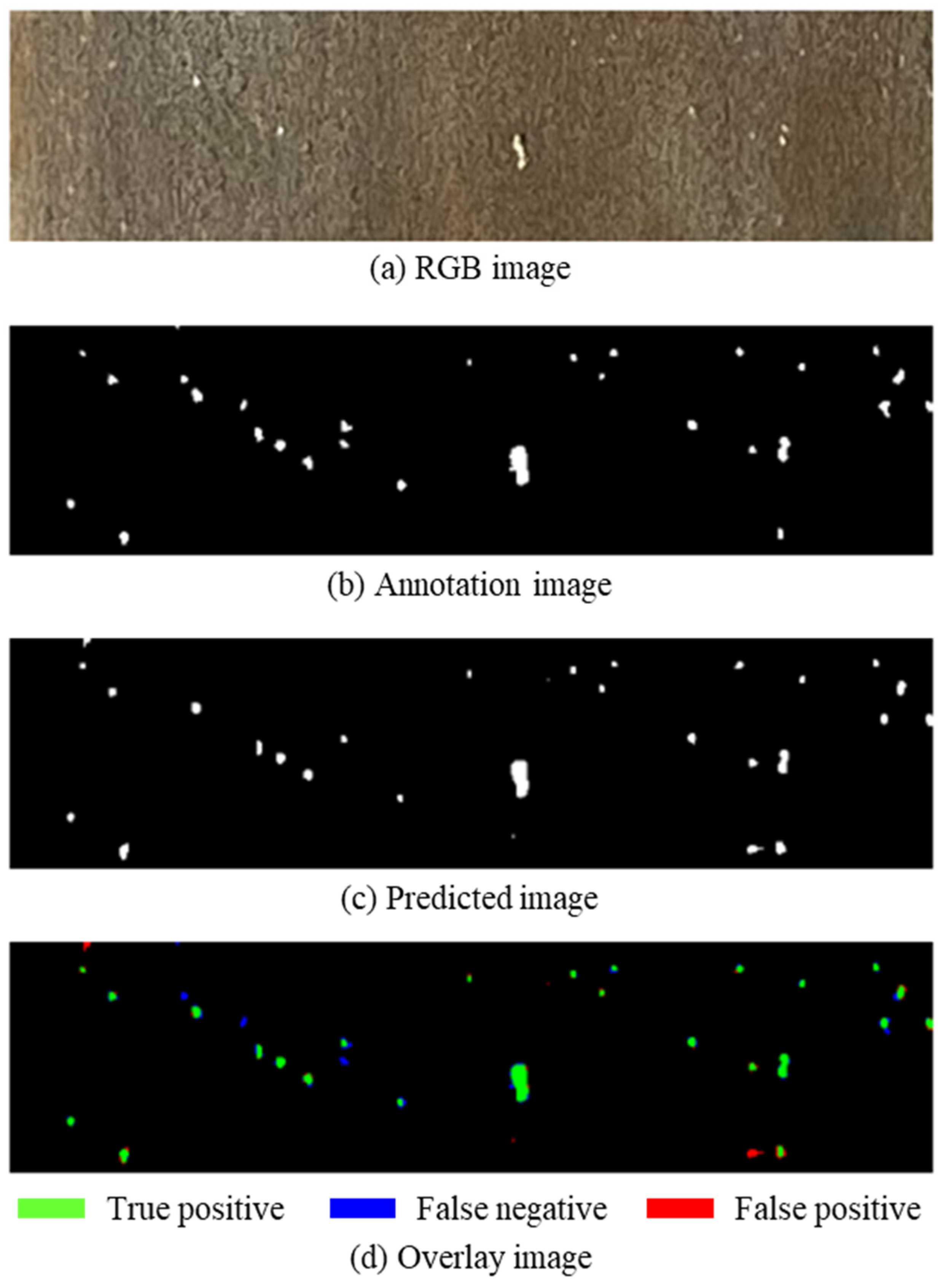 Using the 128 × 128 pixel image subdivision, 100 trials are performed to evaluate the robustness of our deep learning approach. In this optimization stage, the training epoch count was treated as a free hyperparameter and jointly optimized alongside the network channel depth, kernel size, batch size, and data augmentation parameters using Bayesian optimization with the Tree-structured Parzen Estimator (TPE) as the surrogate model. This joint optimization addresses the concern that the epoch count was fixed in the preliminary image-size screening, and ensures that the final model configuration reflects the optimal combination of all relevant hyperparameters. The F1-scores showed a mean value of 0.753, median of 0.760, maximum of 0.816, and minimum of 0.636. The relatively small standard deviation of 0.034 indicated consistent and stable detection performance across multiple iterations. To ensure reproducibility across all 100 trials, model weight initialization was fixed using a random seed. Each trial was assigned a unique combination of hyperparameters by the Bayesian optimizer, and the augmentation behavior was fully determined by the sampled probabilities for blur and vertical flip, introducing no additional uncontrolled stochasticity. Figure 18 illustrates the detection results for pitting corrosion on SUS410 stainless-steel sheet pile surfaces using U-net, while Figure 19 presents the corresponding results for SUS430. Each figure displays four images in vertical sequence: (a) the original RGB image; (b) the ground truth annotation image; (c) the predicted image generated by deep learning; and (d) an overlay image combining ground truth and predictions for accuracy assessment.