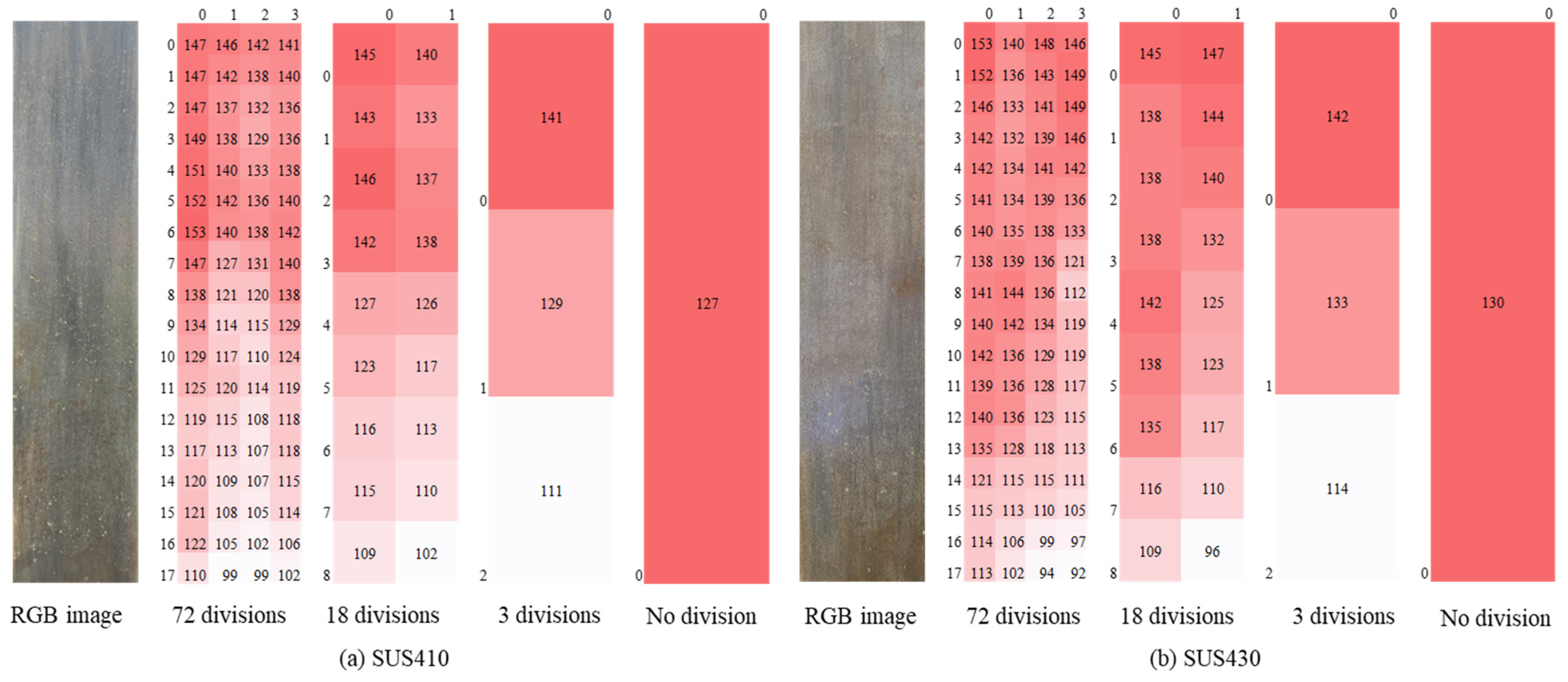 The challenge involved a lack of homogenous lighting across the captured images. Field conditions introduced variations in the surface brightness across images. Figure 22 illustrates the regional brightness variations within the images of both steel grades. The figure presents the average brightness values for different subdivision schemes: 72 divisions (128 × 128 pixels), 18 divisions, three divisions, and no division (whole image). The numerical values displayed in the subdivided regions clearly demonstrate systematic brightness gradients within single images. For SUS410, the brightness values in the upper regions ranged from about 141–147, while the lower regions exhibited values as low as 99–110, representing a decrease of approximately 30–40%. Similarly, SUS430 showed upper region brightness values of 140–153 that decreased to 92–113 in the lower regions, also representing an approximate 30–40% variation. This substantial brightness inhomogeneity arose from natural lighting angles during outdoor image acquisition and the surface reflection properties of the stainless-steel sheet piles. This visualization clearly illustrates that applying uniform threshold values across such images would inevitably produce inconsistent results: threshold values optimized for darker regions would generate excessive false positives in brighter regions, while threshold values optimized for brighter regions would miss genuine pitting in darker regions.