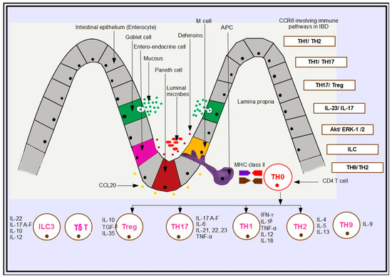 Schematic representation of the CCR6-involving immune pathways in IBD in the gut mucosa and priming of naïve CD4 T cells into effectors in mesenteric lymph nodes with their associated cytokines. Legend: APC—Antigen Presenting Cell; TH—T helper lymphocyte; M—Microfold Cell; Treg—Regulatory Treg Cell; ILC3—Innate Lymphoid Cell 3; MHC Class II—Major Histocompatibility Complex Class II; γδ T—Gamma delta T Cell.