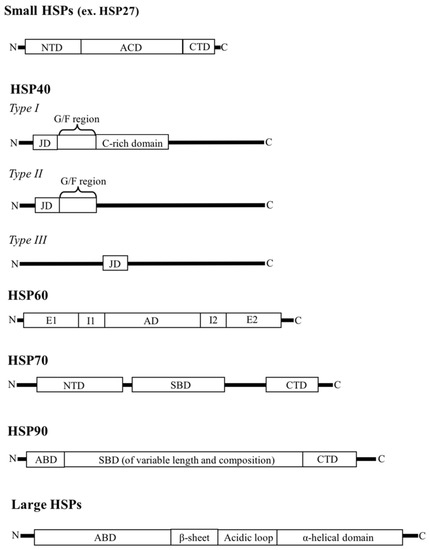 HSPs are categorized into six families based on their molecular weight: small HSPs (sHSPs), HSP40, HSP60, HSP70, HSP90, and large HSPs (lHSPs) (Figure 1).