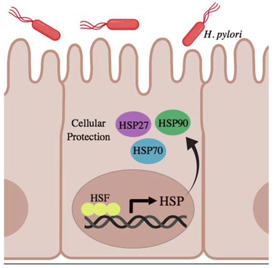 Aptly named cellular gatekeepers, HSPs play an essential role in the maintenance of gastrointestinal homeostasis by rendering epithelial cells in both the stomach and intestine more resistant to stress or injury [73,74]. In response to epithelial disruption, HSFs are activated and translocated into the nucleus, where they bind to the promoter region of the HSP genes (Figure 2) [74].