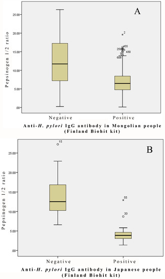 Pepsinogen 1/2 ratio in the H. pylori-negative and -positive groups: (A) 610 Mongolian people; (B) 70 Japanese people.