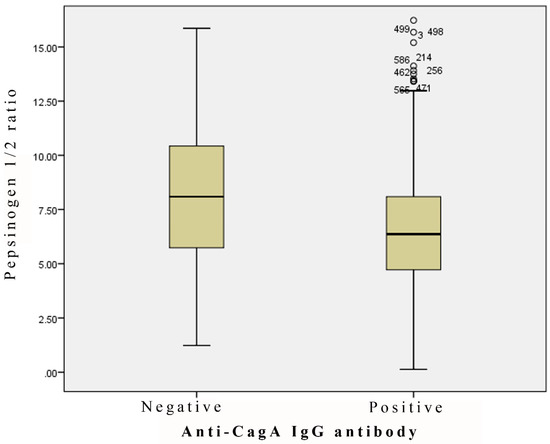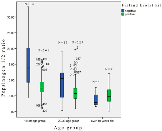 The findings are consistent with reports that atrophic gastritis prevalence in the world is about 7% [30,31]. A definitive atrophy diagnosis through endoscopic and histological examinations requires invasive clinical intervention, although a histological examination using a gastric biopsy is one of the gold standards for the detection of atrophic gastritis and other diseases. In addition, an endoscopic examination for the detection of atrophic gastritis is invasive and uncomfortable, and it is unsuitable for various prevalence studies. Meanwhile, an examination of serum pepsinogen levels is non-invasive in the diagnosis of atrophic gastritis and is often carried out in European countries [32]. The test has a sensitivity of 82% (CI 95%, 70–93%) and a specificity of 98% (CI 95%, 97–99%) in the diagnosis of moderate or severe atrophic gastritis compared to the gold standard method, histopathological biopsy microscopy [33,34]. In this study, the pepsinogen 1/2 ratio was statistically lower in the H. pylori-positive sera than in the H. pylori-negative sera. When the pepsinogen 1/2 ratio was low (<3), the Gastrosoft (Biohit manufacturer) interpretation was “severe atrophic corpus gastritis” [35]. In a study by Nasrollahzadeh, D., et al., the advanced cutoff values in a gastric atrophy assessment were calculated by the pepsinogen 1/2 ratio (<5) (sensitivity: 75.0%, specificity: 91.0%), and this was more suitable for the diagnosis of atrophic gastritis than the manufacturer interpretation (pepsinogen 1/2 ratio: <3) [28]. In the present study, almost all of the Mongolian people were suspected of atrophic gastritis, according to that advanced cutoff value. Because most of the study population was under 40 years old, elderly people with an H. pylori infection could indicate a lower pepsinogen 1/2 ratio. The difference in the pepsinogen 1/2 ratio between H. pylori-positive and -negative groups was greater in the age group of 10–19 than in the other age groups. In the age group of 10–19, some people with serum anti-H. pylori positive antibodies clearly had gastric atrophy. These results suggest that an H. pylori infection could induce serious damage to the gastric mucosa of Mongolian people. The pepsinogen 1/2 ratio obviously decreased with an increase in age, regardless of the presence or absence of anti-H. pylori antibodies. Some risk factors, excluding an H. pylori infection, may have affected gastric atrophy. In addition, the pepsinogen 1/2 ratio in ages 10 to 39 was lower in the anti-H. pylori antibody-positive groups than in the anti-H. pylori antibody-negative groups. Meanwhile, the pepsinogen 1/2 ratio in ages over 40 was lower in the anti-H. pylori antibody-negative groups than in the anti-H. pylori antibody-positive groups. This may indicate that some other risk factors exist with the possibility of influencing gastric atrophy, such as alcohol consumption and high salt usage, at over 40 years of age. In addition, research limitations may have influenced the results of this study by our group, as only three people examined by the Finnish ELISA kit were negative for an H. pylori infection.