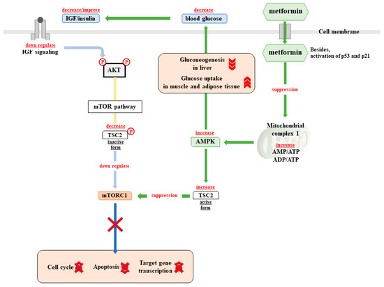 Activation of AMPK is a major factor in the mechanism of oncogenesis by metformin (Figure 1). AMPK suppresses hepatic gluconeogenesis, promotes glucose uptake in muscle and adipose tissue, sensitizes cells to insulin, and reduces insulin levels, thereby reducing IGF-1 levels. As described above, enhancement of the IGF signaling pathway is involved in the development of various carcinomas including colon cancer. Downstream responses are downregulated by reduced signal input of the IGF-1 signaling pathway. Furthermore, AMPK also has mTOR-type suppressive action and can reduce cell proliferation signals.