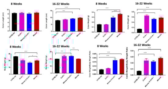 Comparison of the clinical parameters (colon length, colon weight, body weight, colon weight/body weight ratio) of freshly removed colons measured from the ileo-caecal junction to the anus in the four genotypes at 8 weeks and 16–22 weeks of age. Data expressed as Mean ± SEM by one-way analysis of variance (ANOVA) and Tukey’s multiple comparison test, n = 8 per group. ≤ 0.001 (***) and p ≤ 0.0001 (****).