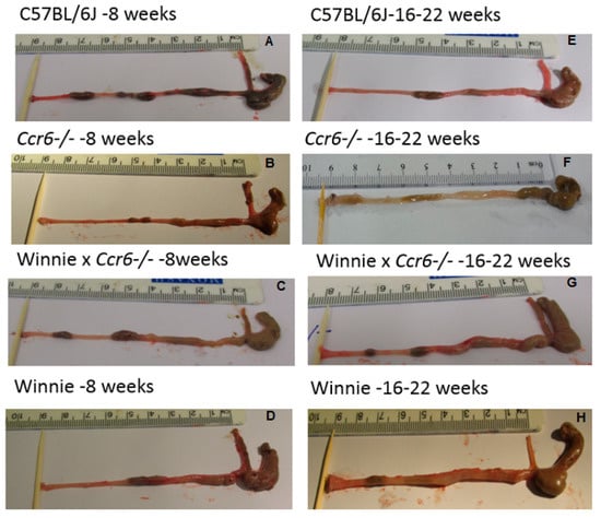 Of gross colon morphology in freshly removed colons measured from the ileo-caecal junction to the anus and before cutting open along the longitudinal axis and luminal contents removed in the four genotypes (WT, Ccr6−/−, Winnie × Ccr6−/− and Winnie) at 8 weeks (A–D) and 16–22 weeks (E–H) of age. Magnification ×1.