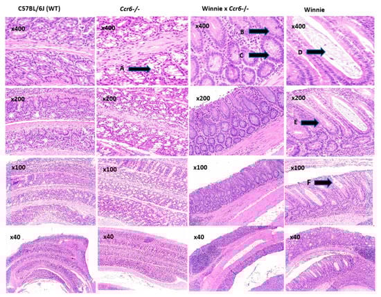 Representative images of H&E colon histomorphologyin C57BL/6J, Ccr6−/−, Winnie × Ccr6−/−, and Winnie at 16–22 weeks of age. Arrows indicate (A) mucus filled goblet cells inside short crypts in Ccr6−/−, (B) moderately elongated crypts in Winnie × Ccr6−/−, (C) mucus filled goblet cells in Winnie × Ccr6−/−, (D) crypt abscess in Winnie, (E) highly elongated crypts in Winnie, (F) mucosal ulcerations in Winnie. Inflammation in the colon was evaluated using histological scheme where a score of 0–5 was used. No inflammation in WT and Ccr6−/− (histological score = 0) while moderate inflammation existed in Winnie × Ccr6−/− (histological score = 2) Severe inflammation was evident in Winnie (histological score = 5). Magnification ×40, ×100, ×200 and ×400.
