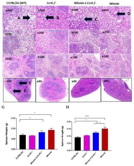 Representative images of H&E in spleen histology in the four genotypes at 16–22 weeks of age. Arrows indicate (A) megakaryocyte in WT, (B) neutrophil reaction in Ccr6−/−, (C) neutrophil reaction in Winnie × Ccr6−/−, (D) neutrophil reaction in Winnie, (E) red pulp, (F) white pulp, (G) comparison of spleen weight in the four genotypes at 8 weeks of age and (H) comparison of spleen weight in the four genotypes at 16–22 weeks of age. Data expressed as Mean ± SEM by one-way analysis of variance (ANOVA) and Tukey’s multiple comparison test, n = 7, p ≤ 0.0001 (****). Inflammation was quantified in the genotypes by counting the numbers of neutrophils in three consecutive similar areas on the slides and comparing the mean value using a scoring index from 0–3, from no inflammation to severe neutrophil infiltration, where WT was zero, Ccr6−/− was 1, Winnie × Ccr6−/− was a moderate 2 and Winnie had a score of 3. Magnification at ×40, ×100, ×200 and ×400.
