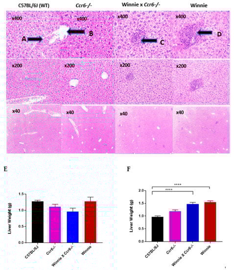 Representative images of H&E in liver histology in the four genotypes at 16–22 weeks of age. Arrows indicate (A) portal tract, (B) central canal, (C) immune cell infiltration indicative of focal lobular inflammation in Winnie × Ccr6−/−, (D) severe focal lobular inflammation in Winnie, (E) comparison of liver weight in the four genotypes at 8 weeks of age, (F) comparison of spleen weight in the four genotypes at 16–22 weeks of age. Data expressed as Mean ±SEM by one-way analysis of variance (ANOVA) and Tukey’s multiple comparison test, n = 7 per group. p ≤ 0.0001 (****). Inflammation was quantified in the genotypes by counting the numbers of immune cell infiltrations which indicate sporadic focal lobular inflammation in three similar areas on the slides and comparing the mean value using a scoring index from 0–3, from no inflammation to severe neutrophil infiltration, where WT was zero, Ccr6−/− was 1, Winnie × Ccr6−/− was a moderate 2 and Winnie had a score of 3.