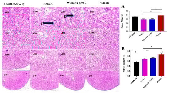 The mean renal weight (of both kidneys) at 8 weeks exhibited a significant difference among the four genotypes; WT: 0.310 ± 0.011 g, Ccr6−/−: 0.294 ±0.017 g, Winnie × Ccr6−/−: 0.275 ± 0.033 g, Winnie 0.391 ± 0.013 g with the Ccr6-deficient model showing an intermediate value compared to WT and Winnie. At the 16–22 weeks, (WT: 0.28 ± 0.017 g, Ccr6−/−: 0.33 ± 0.019 g, Winnie × Ccr6−/−: 0.36 ± 0.021 g, Winnie: 0.43 ± 0.041 g) a significant difference (p < 0.01 (****)) in renal weight existed between WT and Winnie (Figure 6).