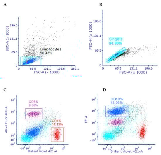 After gating the singlet cell population on FSC-H vs FSC-A axes, to discriminate against the doublets, CD4% gated in red, CD8% gated in maroon and CD19% gated in blue. Over 95% of the cell population remained viable at point of analysis. (A) gating for lymphocytes (B) separating the singlets from doublets (C) gating CD4 and CD8 marker = T lymphocyte percentages (D) gating for CD19 marker = B lymphocyte percentage.