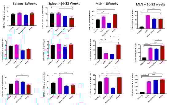 Due to markedly reduced inflammation, the T and B lymphocytes in MLN of Winnie × Ccr6−/− displays decreased production during both time points compared to WT and Winnie. The CD4% in MLN lymphocyte distribution at 8 weeks; WT: 10.2 ± 0.08, Ccr6−/−: 13.93 ± 0.1, Winnie × Ccr6−/−: 6.26 ± 0.27, Winnie: 16.62 ± 0.16 and at 16–22 weeks; WT: 4.66 ± 0.04, Ccr6−/−: 30.77 ± 0.51, Winnie × Ccr6−/−: 22.19 ± 1.27, Winnie: 22.94 ± 0.07 (Figure 8). CD8 % at 8 weeks; WT: 13.5 ± 0.47, Ccr6−/−: 6.93 ± 0.08, Winnie × Ccr6−/−: 5.64 ± 0.08, Winnie: 15.8 ± 0.15 and at 16–22 weeks; WT: 3.65 ± 0.03, Ccr6−/−: 15.74 ± 0.65, Winnie × Ccr6−/−: 14.87± 0.55, Winnie: 18.38 ± 0.72. CD19 % at 8 weeks; WT: 13.0 ± 0.29, Ccr6−/−: 17.0 ± 0.35, Winnie × Ccr6−/−: 6.47 ± 0.24, Winnie: 17.2 ± 0.3, and at 16–22 weeks; WT: 4.31 ± 0.13, Ccr6−/−: 34.18 ± 0.12, Winnie × Ccr6−/−: 37.69 ± 1.1, Winnie: 39.65 ± 0.76 (Figure 8).