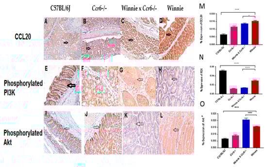 Phosphorylated Akt (AktP) expression pattern in the proximal colon was evaluated to identify the molecular signalling activity by the CCR6-CCL20 axis towards immune homeostasis during spontaneous colitis. The AktP expression at 16–22 weeks in the four genotypes were WT: 0.007 ± 0.0003, Ccr6−/−: 0.009 ± 0.0005, Winnie × Ccr6−/−: 0.02 ± 0.001, Winnie: 0.015 ± 0.0003. Compared to WT, the Ccr6-deficient Winnie model showed a significantly high expression of AktP in the colon (Figure 9I–L).
