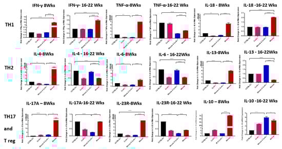 Fold change in mRNA expression of IFN-g, TNF-α, IL-18, IL-4, IL-6, IL-13, IL-17A, IL-23R, IL-10 at 8 weeks and 16–22 weeks. Cycle of threshold (CT) values were normalised to Gapdh and CT calculated using the method of 2−∆CT. Data expressed as Mean ±SEM by One- way analysis of variance (ANOVA) and Tukey’s multiple comparison test, n = 6 per group. **p < 0.01, **** p < 0.0001.