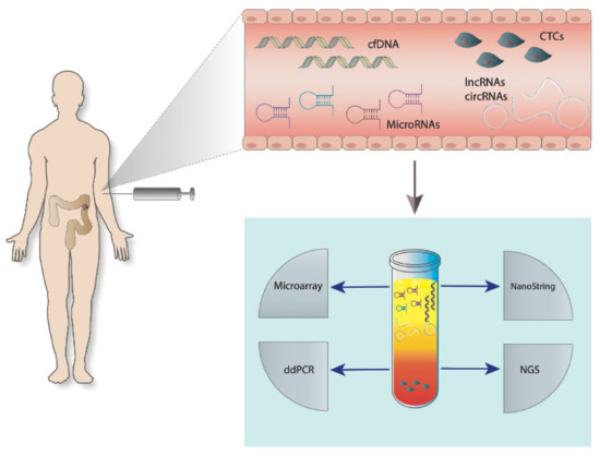 To overcome the limitations of protein markers in diagnostic settings, further DNA- and RNA-based biomarkers, present in liquid biopsies, have been evaluated as potentially new prognostic and predictive markers [137,156,157,158,159,160]. Using minimal invasive approaches could significantly improve the diagnostic and offer new therapeutic possibilities for CRC patients by improving cancer monitoring, as outlined in the following sections.