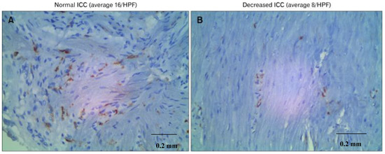 A significant limitation to gaining a better understanding and awareness of the gender differences that exist in gastric emptying is the lack of comprehension that exists at the pathophysiological and cellular levels. For example, it is well established that gastric motility, including motor contractions and electrical pacemaking, are dependent on the function of the interstitial cells of Cajal (ICC), which have also been termed the “gut pacemaker cells” [10,11,12,13,14,15]. Loss of ICC, in addition to cellular damage and network degradation, are recognized cellular hallmarks in patients with gastroparesis. In a study by the National Institutes of Health (NIH) Gastroparesis Clinical Research Consortium (GpCRC), defects in ICC were noted to be the most common histopathological feature in both diabetic and idiopathic gastroparesis [16]. Furthermore, depletion of ICC is the only cellular abnormality shown to have a significant correlation with the severity of gastric emptying in patients with gastroparesis [17,18]. The minimum number of ICC required to support normal gastric emptying has been estimated to be approximately 3 ICC bodies per high-powered field in the gastric circular muscle [18]. Normal numbers of ICC are defined as 20 ± 10 cells per high powered field [19]. A depleted state of ICC is usually defined as less than 10 cells per high powered field based on averaging the ICC numbers in 20 high-powered fields per specimen [Figure 1]. Studies have shown that up to 40% of patients with gastroparesis have depleted numbers of ICC in the smooth muscle of both the gastric body and the antrum [20]. A reduced density of ICC has also been found in patients with gastroparesis-like symptoms, also known as chronic unexplained nausea and vomiting (CUNV) [21,22]. However, to our knowledge, no prior studies have been performed to examine whether abnormalities of ICC density exist between males and females, which might further explain the gender disparity present in gastroparesis. The goal of this research was to investigate gender-associated differences in the number of ICC in the antral and pyloric smooth muscle of diabetic patients with severe symptoms of gastroparesis who were refractory to all standard medical therapies and required surgical intervention.
