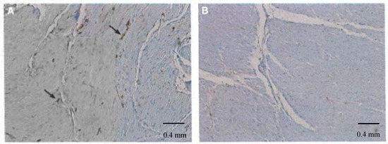 Pyloric interstitial cells of Cajal (ICC) in a control (A) compared to a gastroparetic patient (B) (20×). Pyloric ICC are depleted in this gastroparetic patient. Black arrows indicate c-Kit positive cells. Twenty-six diabetics (42% F, n = 16) provided adequately sized pyloric biopsies. In the pylorus, 68% of females had depletion of ICC (<10 cells/HPF), compared to 80% in males. The scale line represents 0.4 mm.