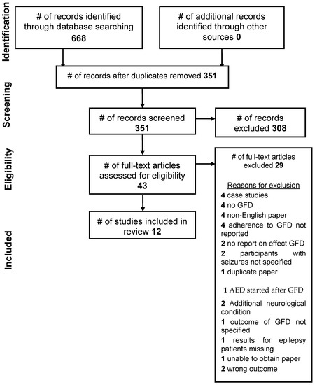 A search was conducted on the International Prospective Register of Systematic Reviews held by the University of York’s Centre for Reviews and Dissemination: PROSPERO [51]. No existing, current or planned systematic reviews regarding GFD and epilepsy were revealed. An attempt was made to register this review with PROSPERO before the data extraction. Data extraction/analysis in this study was undertaken by a single researcher under supervision, so it did not satisfy the requirements for registering with PROSPERO. This review was however conducted in accordance with the Preferred Reporting Items for Systemic Reviews and Meta-Analyses (PRISMA) [52].