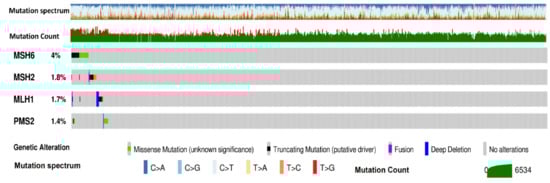 The mismatch repair (MMR) system counteracts nucleotide-pair incongruities not corrected by the DNA polymerase proofreading activity, contributing to the DNA replication fidelity and overall genome stability []. Defects in the MMR system are commonly due to molecular alterations involving the MutS and MutL dimeric homologs, whose interaction leads to the altered bases recognition, excision, and resynthesis [,]. A frequent outcome of MMR deficiency (dMMR) is represented by microsatellite instability (MSI), a condition characterized by multiple alterations in the length of microsatellite regions []. Genomic scars in the MMR system are now known to underlie tumorigenesis and tumor progression due to the high level of accumulating mutations in dMMR cells [].