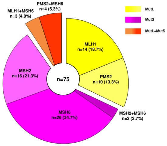 Taken together, the MutS complex was the most frequently altered MMR component, being targeted by mutations and/or deletions in 51 (68.0%) samples. Of these, 2 (2.7%) cases showed alterations in both MutS homologs, while 16 (21.3%) and 26 (34.7%) cases harbored private mutations in MSH2 and MSH6, respectively. Notably, none of the MutL-deficient tumors displayed mutations and/or deep deletions involving a protein-pair. Hence, 10 (13.3%) and 14 (18.7%) GEC were altered in PMS2 and MLH1, respectively. Finally, a subset of patients (n = 7, 9.3%) had both MutL and MutS complexes impaired, including 3 (4.0%) and 4 (5.3%) cases with MLH1/MSH6 and PMS2/MSH6 altered pairs, respectively. The relative prevalence of MMR alterations across the four components, as well as the co-occurrence of multiple mutations in different genes, are outlined in Figure 2.