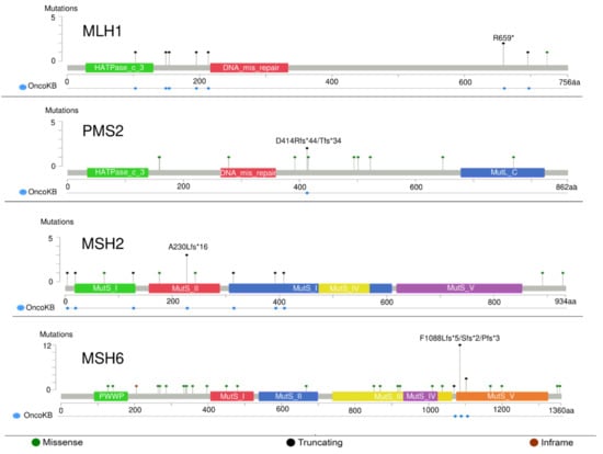 Among the truncating, missense, and inframe mutations detected, the highest prevalence of likely loss-of-function alterations was observed for MLH1 and MSH2, while only the hotspot regions in positions 414 and 1070–1104 were targeted by likely oncogenic mutations in PMS2 and MSH6, respectively (Figure 3).