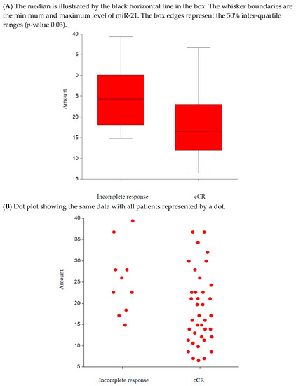 In the observation group, the median tumor expression of miR-21 was 16.6 (95% CI 13.9–21.1). In patients without cCR, the median level was 24.3 (95% confidence interval (CI) 17.1–36.8). The difference was statistically significant (