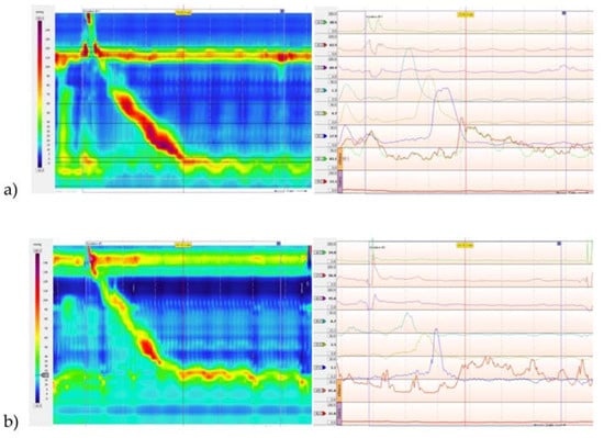 (a) High-resolution esophageal motility study from patient 1 showing normal lower esophageal sphincter (LES) pressure with normal relaxation of the LES. The amplitude of the peristaltic contractions are normal in the smooth muscle portion of the esophagus. Striated muscle function was not normal and there appeared to be some retrograde movement into the pharynx with wet swallows and intermittent coughing. The fleck of red above the upper sphincter with the swallow suggests some retention and pharyngeal presence of the water swallowed—corresponding to food if the patient was eating. The upper sphincter relaxation appeared to be present but pharyngeal contractions were weak. (b) Example of a normal high-resolution esophageal motility study.