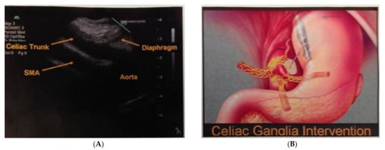 - Rathmell, J.P.; Gallant, J.M.; Brown, D.L. Computed tomography and the anatomy of celiac plexus block. Reg. Anesth. Pain Med. 2000, 25, 411–416. [Google Scholar] [CrossRef] [PubMed]