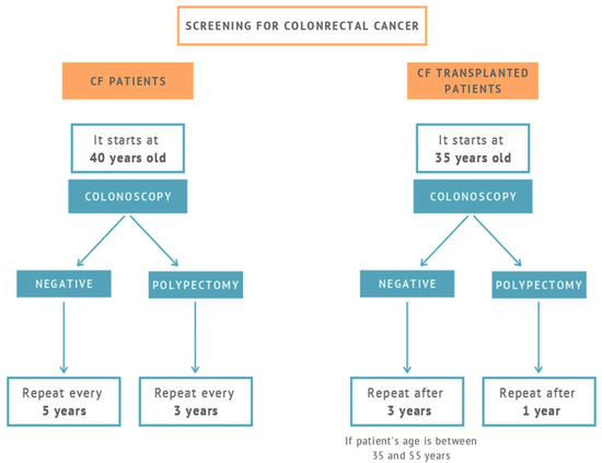 In transplanted CF patients, the Task Force of Cystic Fibrosis suggests colonoscopy screening should start from the age of 35 if the organ transplant occurred at the age of 30 years [21]. In transplanted CF patients before the age of 30, colonoscopy screening should start from the age of 30 [21]. The risk of CRC in transplanted CF patients is greater than in Lynch Syndrome (LS), considering that LS is one of the most common hereditary CRC syndromes [20], and it is always important to consider the presence of very large polyps (>3 cm in diameter) and multiple polyps in the colon (number > 10). The current consensus recommendations about CRC in CF patients are supported by the cost effectiveness analysis. Data for the cost effectiveness analysis were obtained from simulation models for CRC [52]. Abraham et al. consider that the optimal interval for the second colonoscopy screening in CF transplanted patients with a prior negative examination should be considered after 3 years if patients’ age is between 35 and 55 years [53]. In case of very large polyps, multiple polyps or high-grade dysplasia, the surveillance interval should be shortened, and the patient should undergo a new colonoscopy within 1 year [54].