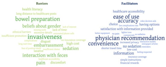 Word clouds (in which the size of each word indicates its frequency or importance) of the most cited barriers and facilitators to colorectal cancer screening—Created with https://worditout.com/ (accessed on 20 August 2021). Definitions: Barriers = factors that could limit or restrict participation in colorectal cancer screening; Facilitators = factors that could either promote or be perceived as the most important attributes that facilitate decision making towards participation in colorectal cancer screening.