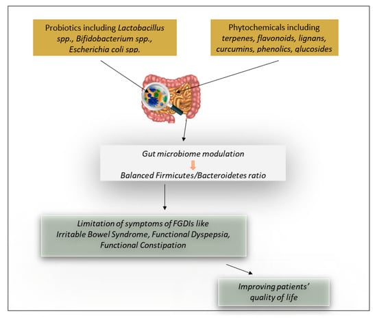 Recent studies have investigated the effect of probiotic and phytochemical consumption on human health. These bioactive compounds seem to play an important role in the regulation of gut microbiota and, more specifically, in regard to the Bacteroidetes and Firmicute concentration ratio. Therefore, patients with FGIDs, including irritable bowel syndrome, functional dyspepsia, and functional constipation, can benefit from the consumption of these bioactive compounds to treat and reduce their symptoms (Figure 1).