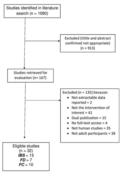 The following databases were searched: MEDLINE (PubMed), ScienceDirect, and Google Scholar. Combinations of specific keywords, such as “irritable bowel syndrome” or “functional dyspepsia” or “functional constipation”, and “probiotics” or “phytochemicals”, were used. This review was performed in accordance to the Preferred Reporting Items for Systematic Reviews and Meta-Analyses Extension for Scoping Reviews (PRISMA-ScR) [83].