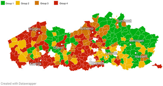 - Group 4: BC municipal uptake < median uptake of Flemish municipalities, CRC municipal uptake < median uptake of Flemish municipalities (“low BC, low CRC”).
