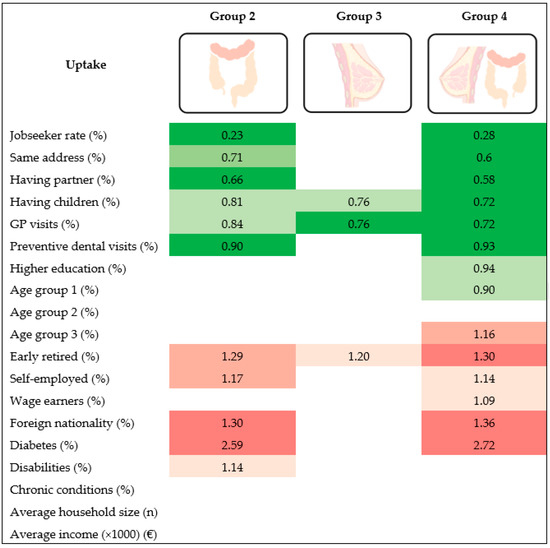 As above mentioned, each municipality was assigned a screening uptake profile and Group 1 (“high BC, high CRC”) was used as the reference group in all analyses. As a consequence, municipalities with characteristics that are negatively associated (OR < 1) with Group 2 (“high BC, low CRC”), Group 3 (“low BC, high CRC”), or Group 4 (“low BC, low CRC”) are more likely, in comparison to the median uptake of all Flemish municipalities, to have a better performance in terms of screening uptake (more likely to be in Group 1, our reference group). By contrast, municipalities with characteristics that are positively associated (OR > 1) with Group 2 (“high BC, low CRC”) or Group 3 (“low BC, high CRC”) are more likely to perform, in comparison to the median uptake of all Flemish municipalities, better with regards to one screening and worse with regards to the other. Accordingly, municipalities with characteristics that are positively associated (OR > 1) with Group 4 (“low BC, low CRC”) are more likely to have worse performance in terms of screening uptake for both BC and CRC in comparison to the median uptake of Flemish municipalities.