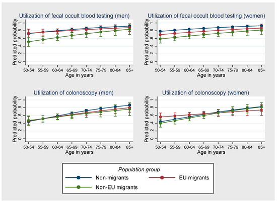 Whereas the respective three-way interaction terms included into the model were not significant at p < 0.05, a graphical inspection of the predicated probabilities indicates that, particularly for men, disparities between migrants and non-migrants with respect to the utilization of fecal occult blood testing tended to decrease with age, but increased for the utilization of colonoscopy (Figure 1).