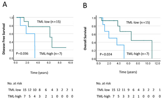 We further evaluated TML as a potential prognostic biomarker for poor outcomes in CRC using Kaplan–Meier survival analysis. We found that, in our CRC patient cohort, TML-high was significantly associated with worse DFS (p = 0.036, Figure 1A) and OS (p = 0.024; Figure 1B). This further suggests that TML may be a positive predictive factor for determining the prognosis of patients with CRC.