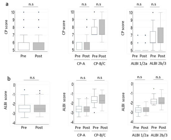 Changes in the liver function reserve after vaccination. (a) Child–Pugh (CP) score in all patients with cirrhosis (left, n = 111), CP class A (n = 91) and B/C (n = 20) (middle), and ALBI grade 1/2a (n = 82) and 2b/3 (n = 42) (right). (b) Liver function reserve as assessed by the ALBI score in all patients with cirrhosis before and after vaccine (left, n = 124), CP class A and B/C (middle), and ALBI grade 1/2a and 2b/3 (right). n.s.: not significant.