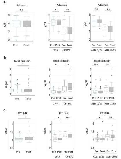 Changes in serum albumin ((a), n = 124), total bilirubin ((b), n = 125), and prothrombin-time INR ((c), n = 110) after vaccination in patients with cirrhosis. All patients are shown in the left panel, CP class A (n = 91) and B/C (n = 20) are shown in the middle panel, and ALBI grade 1/2a (n = 82) and 2b/3 (n = 42) are shown in the right panel. *: p < 0.05, n.s.: not significant.
