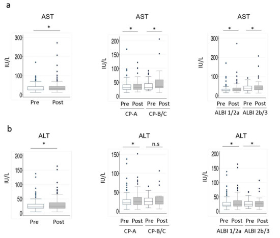 Changes in serum AST ((a), n = 125) and ALT ((b), n = 125) levels after vaccination in patients with cirrhosis. All patients are shown in the left panel, CP class A (n = 91) and B/C (n = 20) are shown in the middle panel, and ALBI grade 1/2a (n = 82) and 2b/3 (n = 42) are shown in the right panel. *: p < 0.05, n.s.: not significant.