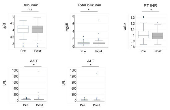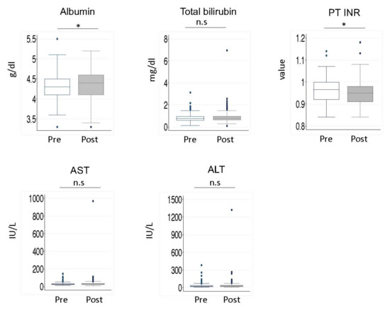 Changes in serum albumin (n = 218), total bilirubin (n = 216), prothrombin-time INR (n = 102), AST (n = 220), and ALT (n = 220) levels after vaccination in non-cirrhotic patients. *: p < 0.05, n.s.: not significant.