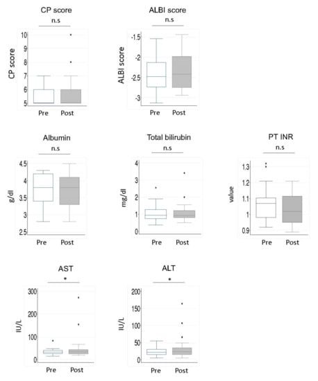 Changes in liver function reserve, serum albumin, total bilirubin, prothrombin-time INR, AST, and ALT levels after vaccination in patients with both cirrhosis and autoimmune diseases (n = 28). *: p < 0.05, n.s.: not significant.