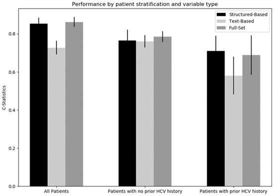 The average C-statistics on the structured-based, text-based, and full-set models for all the patients were 0.777 (95% CI: 0.744–0.810), 0.677 (95% CI: 0.631–0.723), and 0.774 (95% CI: 0.735–0.813), respectively. C-statistics are summarized by patient stratification and model variable types in Table 3 and Figure 1. There were no statistically significant differences between the structured-based models and the full-set models. For patients with no history of HCV prior to 2020, there were no significant differences between the three model variable types. For patients with a history of HCV prior to 2020, the text-based model performed worse than both the structured-based and the full-set models; there was no statistically significant difference between the structured-based and full-set models. Text-based models were statistically significantly (p-value < 0.001) better for patients with no history compared to patients with a history of HCV prior to 2020.