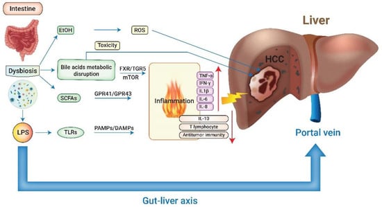 Recent studies revealed that dysbiosis promotes chronic hepatitis B, alcohol-related liver disease (ALD), and NAFLD [47,48,49]. HCC develops as a result of chronic complex disease processes in the liver and persistent inflammation combined with immune dysregulation. About 80–90% of HCC cases occur in patients with cirrhosis. About one-third of patients with cirrhosis end up with HCC in their lifetime. Thus, chronic liver diseases should be considered as HCC precursors [15,50].