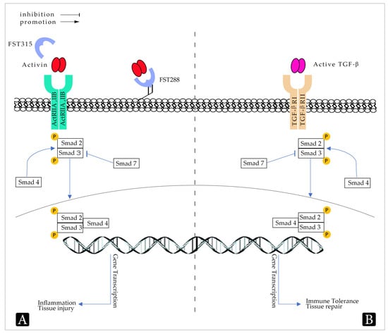 Depiction of key roles of TGF-β family members in the setting of gut inflammation with relevance to IBD. (A) Activin and follistatin pathways and (B) TGF-β pathways. FST = follistatin, TGF-β = transforming growth factor-β.