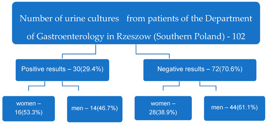 A retrospective analysis of urine culture results was conducted for adult patients treated between 1 January 2017 and 31 December 2021 at the Department of Gastroenterology in Rzeszow (southern Poland). A total of 102 patients were sampled for microbiological tests during the analyzed period, with microbial growth found in 30 samples. The purpose of our study was to determine the predominant bacterial species present in the urine of patients hospitalized in the Department of Gastroenterology, as well as their drug susceptibility. The data obtained from medical records included, for example, urine culture results and the antibiotic susceptibility of the isolated microorganisms. The material for the study was collected according to the current procedures. During the analyzed period, urine was collected from a total of 102 patients, and 30 positive samples were found. The predominant pathogen was Escherichia coli (n = 10 (33.33% of all positive results), p < 0.001); the second most common microorganism was Enterococcus faecalis (n = 5 (16.67% of all positive results), p < 0.001). In vitro susceptibility testing showed E. coli, ESBL (ESBL strain with extended-spectrum beta-lactamase) (n = 2 (6.67% of all positive results), p = 0.055) and Klebsiella pneumoniae, ESBL (n = 3 (10% of all positive results), p = 0.005). Urinary tract infection (UTI) was an extremely common problem.