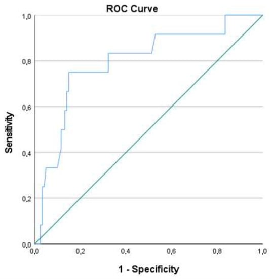 A ROC curve was then created, using the model’s predictive probabilities. The area under the curve (AUC) obtained was 0.795 (CI: 0.716; 0.860) (Figure 1). A cut-off point of 0.138 was chosen as the value that maximized both specificity and sensitivity. A second analysis was performed using the new cut-off point, resulting in a model that could correctly classify 84.2% of cases (with 75.0% sensitivity and 85.1% specificity).